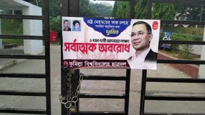 কুমিল্লা বিশ্ববিদ্যালয়ের (কুবি) মূল ফটকে তালা দিয়েছে শাখা ছাত্রদল। রোববার সকাল সাড়ে ৬টায় অবরোধের সমর্থনে শাখা ছাত্রদলের সদস্য সচিব মোস্তাফিজুর রহমান শুভর নেতৃত্বে মূল ফটকের