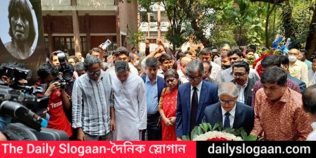 নিজ কর্মস্থল ঢাকা বিশ্ববিদ্যালয়ে সহকর্মী ও অনুরাগীদের ফুলেল শ্রদ্ধায় সিক্ত হলেন একুশে পদকপ্রাপ্ত প্রয়াত ভাস্কর শামীম সিকদার।