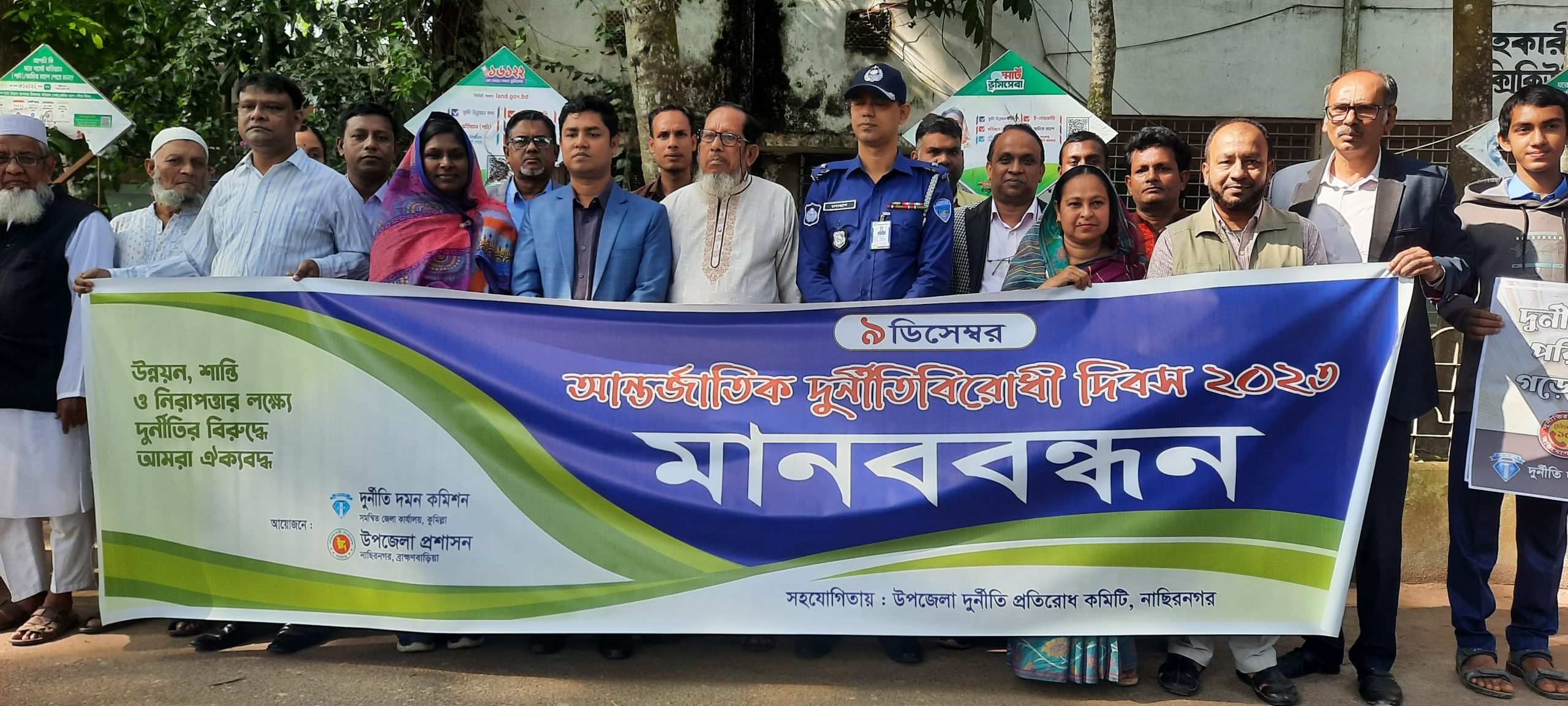 “উন্নয়ন,শান্তি ও নিরাপত্তার লক্ষ্যে দুর্নীতির বিরুদ্ধে আমরা ঐক্যবদ্ধ”এই প্রতিপাদ্যকে সামনে রেখে ব্রাহ্মণবাড়িয়ার নাসিরনগরে জাতীয় পতাকা উত্তোলন,মানববন্ধন ও আলোচনা সভার মধ্য দিয়েই আন্তর্জাতিক দূর্নীতি বিরোধী দিবস পালিত হয়েছে।