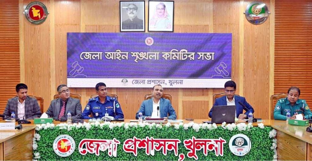 খুলনা জেলা আইনশৃঙ্খলা কমিটির মাসিক সভা অনুষ্ঠিত হয়েছে। রোববার সকালে জেলা প্রশাসক খন্দকার ইয়াসির আরেফীনের সভাপতিত্বে তাঁর সম্মেলনকক্ষে অনুষ্ঠিত সভায় পুলিশ সুপার মোহাম্মদ সাঈদুর রহমান বলেন, জেলার আইনশৃঙ্খলা পরিস্থিতি স্বাভাবিক রয়েছে। হরতাল বা অবরোধের সময় সড়ক-মহাসড়কে পণ্য পরিবহনে অধিকতর নিরাপত্তার প্রয়োজন হলে ব্যবসায়িরা পুলিশের সহায়তা নিতে পারেন। আইনশৃঙ্খলা স্বাভাবিক রাখতে সড়কে পুলিশের টহল বৃদ্ধি করা হয়েছে। এছাড়া আইনশৃঙ্খলার অবনতি ঘটানোর চেষ্টা, অপরাধ সংঘটন, মাদক পরিবহন বা বিক্রী বিষয়ে পুলিশকে তথ্য দিয়ে সহায়তা করলে এসকল অপরাধ দমনে পুলিশ আরও কার্যকর ভূমিকা রাখতে পারবে।