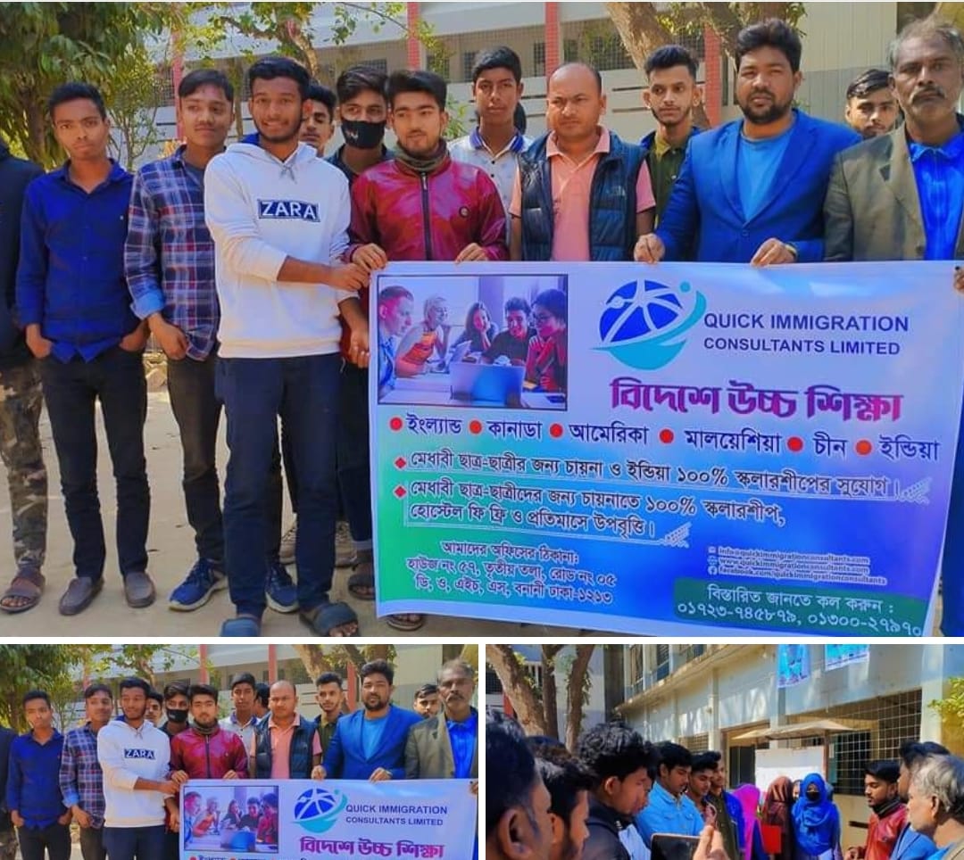 এসময়, কুইক ইমিগ্রেশন কনসালটেন্ট লিমিটেড এর চেয়ারম্যান মোঃ রবিউল ইসলাম বলেন, 'চাকরির বাজারে নেতৃত্ব দেয়ার জন্য শিক্ষার্থীদেরকে যোগ্য ও যুগোপযোগী হিসেবে গড়ে তোলার জন্য উচ্চ শিক্ষায় শিক্ষিত হয়ে নিজেকে গড়ে তুলতে হবে।'