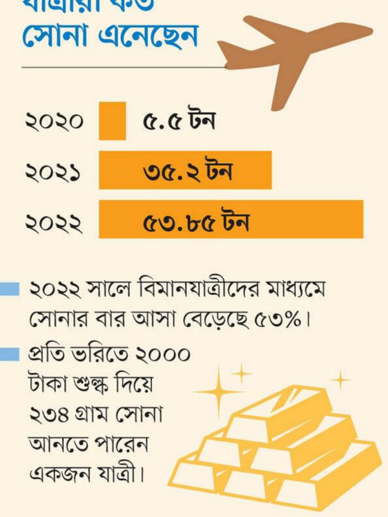 বিদেশ থেকে বাংলাদেশে আসা বিমানযাত্রীদের হাত ধরে সোনা নিয়ে আসার চাহিদা বাড়ছে। ২০২২ সালে দুই বিমানবন্দর দিয়ে প্রায় ৫৪ টন সোনা এসেছে, যার বর্তমানে বাজারমূল্য ৪৫ হাজার কোটি টাকার বেশি। পরিমাণের দিক দিয়ে ২০২১ সালের তুলনায় ২০২২ সালে সোনা আসা বেড়েছে ৫৩ শতাংশ।