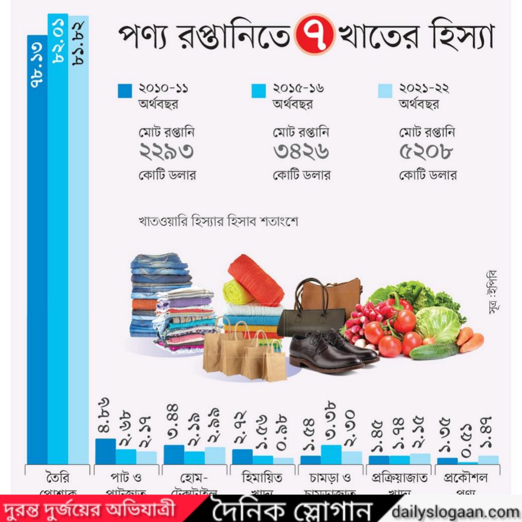 এক যুগ আগে ২০১০-১১ অর্থবছরে ২ হাজার ২৯৩ কোটি ডলারের পণ্য রপ্তানি হয়েছে। এর মধ্যে ৭৮ শতাংশ আসে তৈরি পোশাক খাত থেকেই। গত ২০২১-২২ অর্থবছরে ৫ হাজার ২০৮ কোটি ডলার রপ্তানির মধ্যে প্রায় ৮২ শতাংশই তৈরি পোশাক খাত থেকেই এসেছে।
