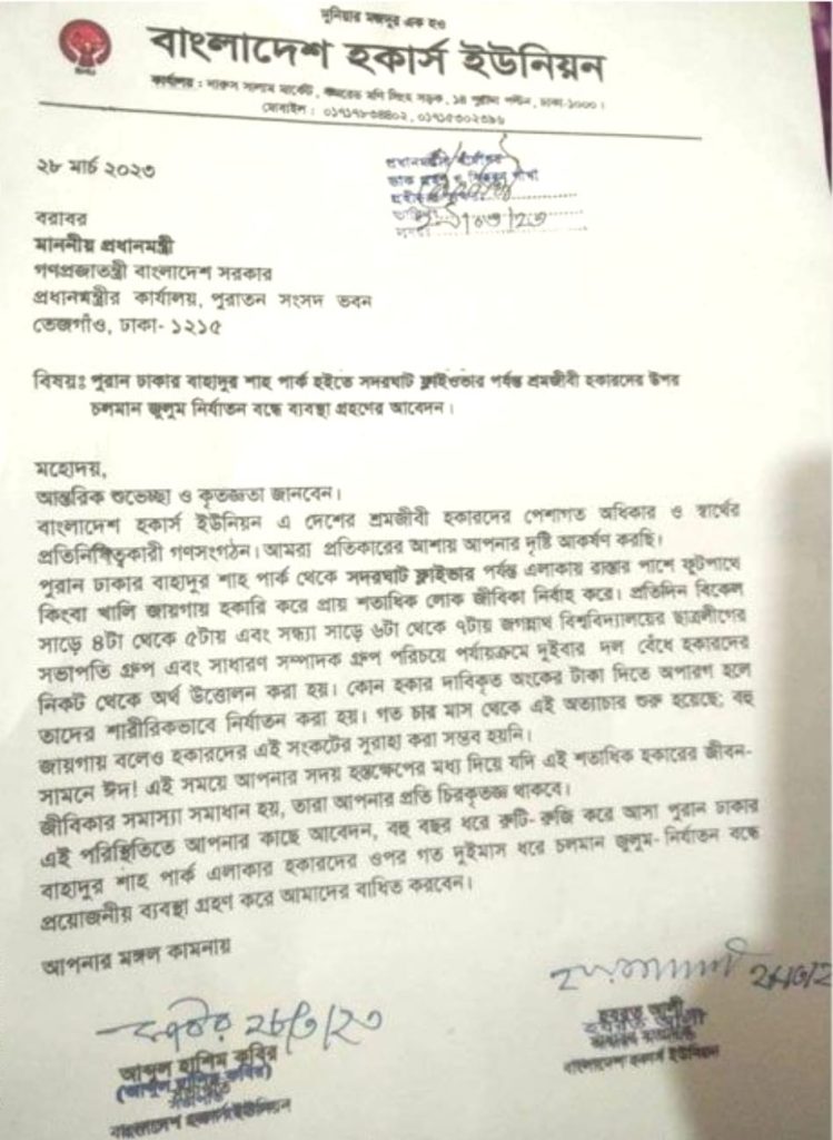 চলমান এই জুলুম-নির্যাতন বন্ধে প্রয়োজনীয় ব্যবস্থা গ্রহণের দাবি জানিয়ে চিঠিতে আরও বলা হয়, কোনো হকার দাবিকৃত অংকের টাকা দিতে অপারগ হলে তাদের শারীরিকভাবে নির্যাতন করা হয়। গত চার মাস থেকে এই অত্যাচার চলছে। বিভিন্ন জায়গায় বলেও হকারদের এই সংকটের সুরাহা করা সম্ভব হয়নি।