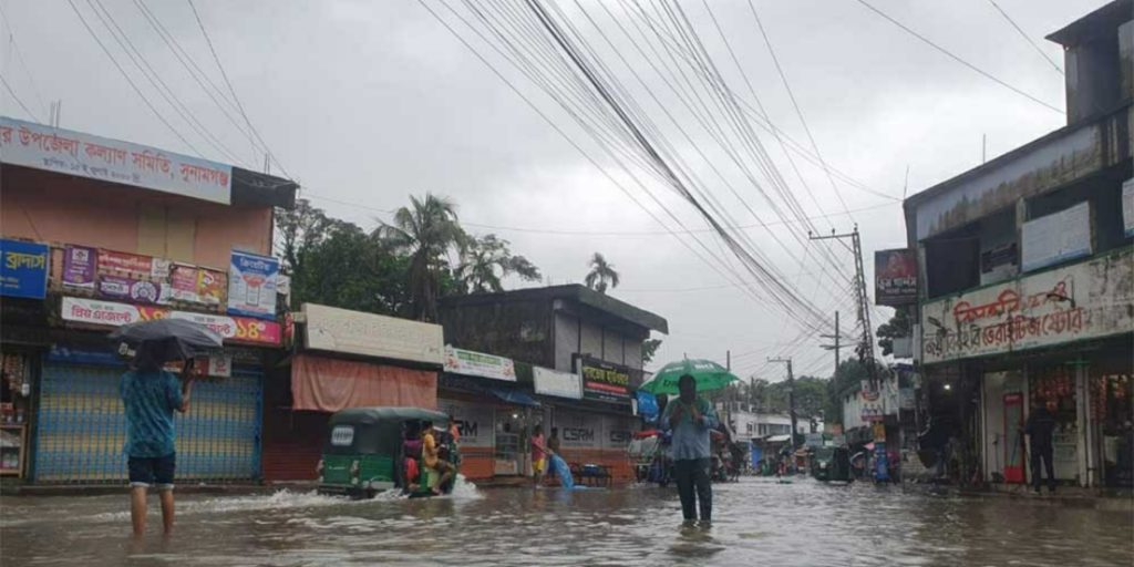 সুনামগঞ্জ বারীপাত স্টেশনে ৩৩২ মিলিমিটার বৃষ্টিপাতে এবং উজানের ঢলে সুনামগঞ্জের নদ-নদীর পানি বৃদ্ধি পেতে শুরু করে। রবিবার সকালে সুনামগঞ্জ শহরের নিম্নাঞ্চল হিসেবে পরিচিত কাজির পয়েন্ট, সাহেববাড়ি ঘাটপ