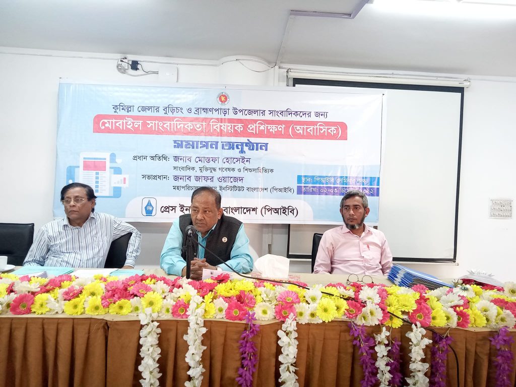 প্রেস ইনস্টিটিউট বাংলাদেশ(পিআইবি)’র আয়োজনে কুমিল্লা জেলার বুড়িচং ও ব্রাক্ষণপাড়া উপজেলার সাংবাদিকদের জন্য (০২-০৩ ডিসেম্বর) দুইদিনব্যাপী প্রশিক্ষণ শেষ হয়েছে। আজ বিকেলে পিআইবি’র সেমিনার কক্ষে অনুষ্ঠিত প্রশিক্ষণের সমাপন অনুষ্ঠানে প্রধান অতিথি হিসেবে উপস্থিত ছিলেন সাংবাদিক,মুক্তিযুদ্ধ গবেষক ও শিশুসাহিত্যিক মোস্তফা হোসেইন। প্রধান অতিথির বক্তব্যে তিনি বলেন, সাংবাদিকতার ক্ষেত্রে মোবাইল সাংবাদিকতার ব্যাপ্তি বেড়েছে। মোবাইল সাংবাদিকতা বর্তমানে দ্রুত এবং জনপ্রিয় একটি সংবাদ মাধ্যম যার সহায়তায় প্রতিবেদক বিভিন্ন ধরনের বহনযোগ্য ইলেক্ট্রনিক যন্ত্র ব্যবহার করে এবং ইন্টারনেটের সহায়তায় সংবাদ তৈরি, সম্পাদনা এবং নিজের কমিউনিটিতে দ্রুত ভাগাভাগি করতে পারে বলে জানান এই সিনিয়র সাংবাদিক। একজন প্রতিবেদকের মতোই বিভিন্ন সময়ে মোবাইল সাংবাদিক, ফ্রিল্যান্স সাংবাদিকও হতে পারেন যিনি ডিজিটাল ক্যামেরা এবং ক্যামকর্ডার, ল্যাপটপ, কম্পিউটার, স্মার্টফোন অথবা ট্যাবলেট কম্পিউটার ব্যবহার করেন নিজের কাজের জন্য। তিনি মোবাইল সাংবাদিকতার ক্ষেত্রে অডিও, ভিডিও এবং ভিজুয়্যাল এর উপর গুরুত্ব দিয়ে প্রযুক্তি ক্ষেত্রে জ্ঞান অর্জনের তাগিদ দেন।