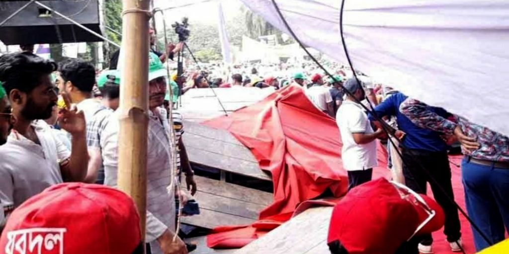 হঠাৎ স্টেজটি ধসে পড়ে। অনেক নেতাকর্মী মঞ্চে উঠে পড়ার ফলে এমনটি হয়েছে।