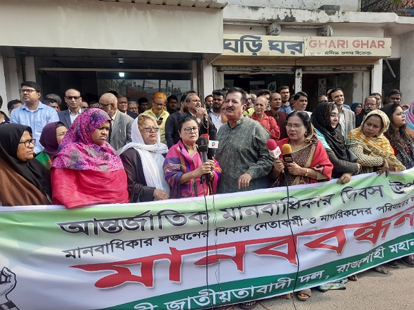 বিশ্ব মানবাধিকার দিবস উপলক্ষে রাজশাহীতে মানববন্ধন করেছে বিএনপি ও বিভিন্ন পেশাজীবি সংগঠনের নেতাকর্মীরা।