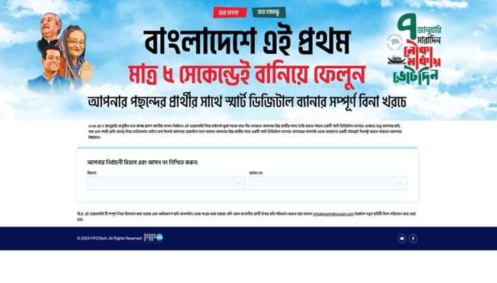 ৭ জানুয়ারি, দ্বাদশ জাতীয় সংসদ নির্বাচন। আওয়ামী লীগের মনোনীত আসনে আওয়ামী লীগের প্রার্থীদের তথ্য ও ছবি যুক্ত করা আছে ওই ওয়েবসাইটে। যে কেউ নিজের ছবি, নাম, পদবী ব্যবহার করে সংশ্লিষ্ট প্রার্থীর সঙ্গে সহজেই নির্বাচনী ব্যানার বানাতে পারবেন।