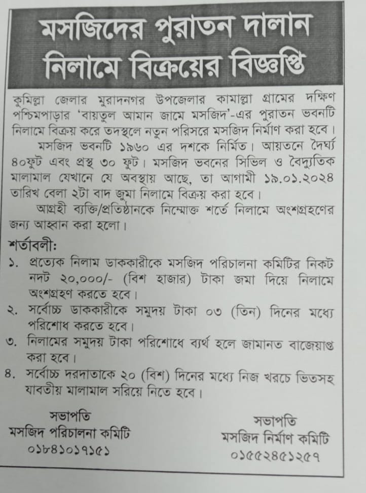 কুমিল্লার মুরাদনগরে মসজিদের পুরাতন ভবন ও মালামাল নিলামে বিক্রয় করা হবে। আজ বুধবার (১০ জানুয়ারি) মসজিদ পরিচালনা ও নির্মাণ কমিটির সভাপতি এ তথ্য জানান। তিনি বলেন, ১৯৬০ এর দশকে নির্মিত কামাল্লা গ্রামের দক্ষিণ পশ্চিমপাড়ার “বায়তুল আমান জামে মসজিদ ’’ এর পুরাতন ভবনটি ভেঙ্গে নতুন পরিসরে মসজিদ নির্মাণ করা হবে। মসজিদটির আয়তন দৈর্ঘ্য ৪০ ফুট এবং প্রস্থ ৩০ ফুট। মসজিদটি নতুনভাবে নির্মাণের কারণে পুরাতন ভবন ও বৈদ্যুতিক সরঞ্জামাদি বিক্রয় করা হবে। আগামী ১৯ জানুয়ারি ২০২৪ বেলা ২টায় বাদ জুমা নিলামে বিক্রয় করা হবে। নিলামে অংশগ্রহণকারী দরদাতাকে মসজিদ পরিচালনা কমিটির নিকট ২০,০০০/ ( বিশ হাজার ) টাকা জমা দিয়ে অংশগ্রহণ করতে হবে। এবং সর্বোচ্চ দরদাতাকে তিন (০৩) দিনের মধ্যে সমুদয় টাকা পরিশোধ করতে হবে। অন্যথায় জামানত বাজেয়াপ্ত হবে। এছাড়া সর্বোচ্চ করদাতাকে ২০ ( কুড়ি) দিনের মধ্যে নিজ খরচে ভবনের ভিতসহ অন্যান সরঞ্জমাদি সরিয়ে নিতে হবে।