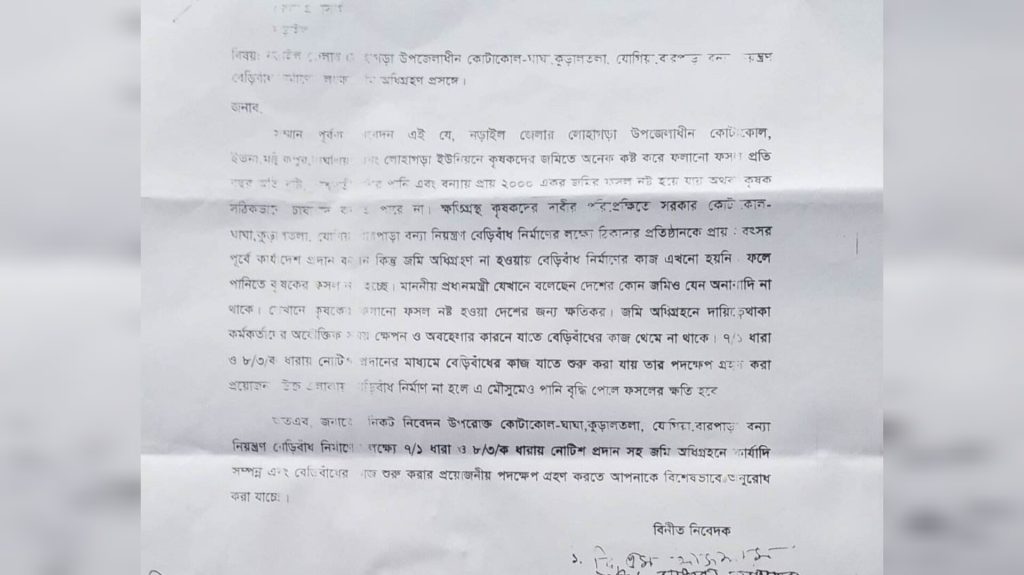 কৃষকরা সঠিকভাবে চাষাবাদ করতে পারে না ক্ষতিগ্রস্ত কৃষকদের দাবির প্রেক্ষিতে পরিপ্রেক্ষিতে সরকার কোটাকোল, ঘাঘা, কুড়ালতলা, যোগিয়া, বারপাড়া,মৌজে মধুমতী নদীর পাশে বন্যা নিয়ন্ত্রণ বেড়িবাধ নির্মাণের লক্ষ্যে ঠিকাদার প্রতিষ্ঠানকে প্রায় এক বছর পূর্বে কার্যাদেশ প্রদান করেন। কিন্তু জমি অধিগ্রহ না হওয়ায় বেড়ীবাধ নির্মাণের কাজ এখনো হয়নি ফলে বর্ষা মৌসুমে নদীর পানি প্রবেশ করে হাজার হাজার একর জমির ফসল নষ্ট হওয়ার ভয়ে আতঙ্কিত কৃষক। এলাকাবাসীর দাবি জমি অধিগ্রহণের দায়িত্বে থাকা কর্মকর্তাদের অযৌক্তিক সময় ক্ষেপণ ও অবহেলার কারণে যাতে বেড়িবাধের কাজ থেমে না থাকে সে ব্যাপারে শত শত গ্রামবাসীর পক্ষ থেকে জেলা প্রশাসক বরাবর দ্রুত কাজ শুরুর জন্য প্রয়োজনীয় পদক্ষেপ গ্রহণে দরখাস্ত প্রদান করা হয়।