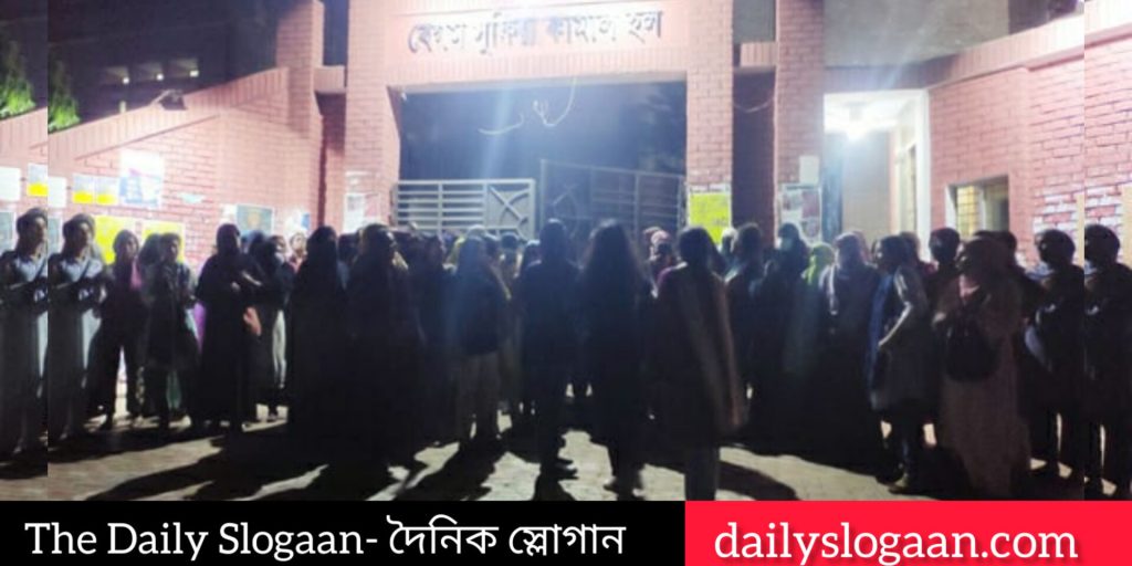 এ সময়ে,বাঁচার মতো বাঁচতে চাই, নিরাপদ হল চাই, প্রশাসনের নীরবতা মানি না, মানব না, আমার বোন হ্যারেজড কেন? প্রশাসন জবাব চাই স্লোগান দিতে থাকে ও হলের মূল ফটকে অবস্থান নেয়।