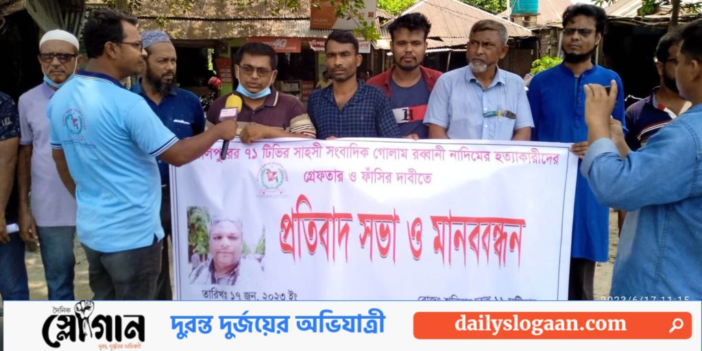 বাংলা নিউজ ২৪. কমের জামালপুর জেলা সংবাদদাতা ও ৭১ টিভির বখশিগঞ্জ উপজেলা সংবাদদাতা গোলাম রব্বানী নাদিমের খুনিদের গ্রেফতার ও ফাঁসির দাবিতে নড়াইলের লোহাগড়ায় প্রতিবাদ সভা ও মানববন্ধন করা হয়েছে।