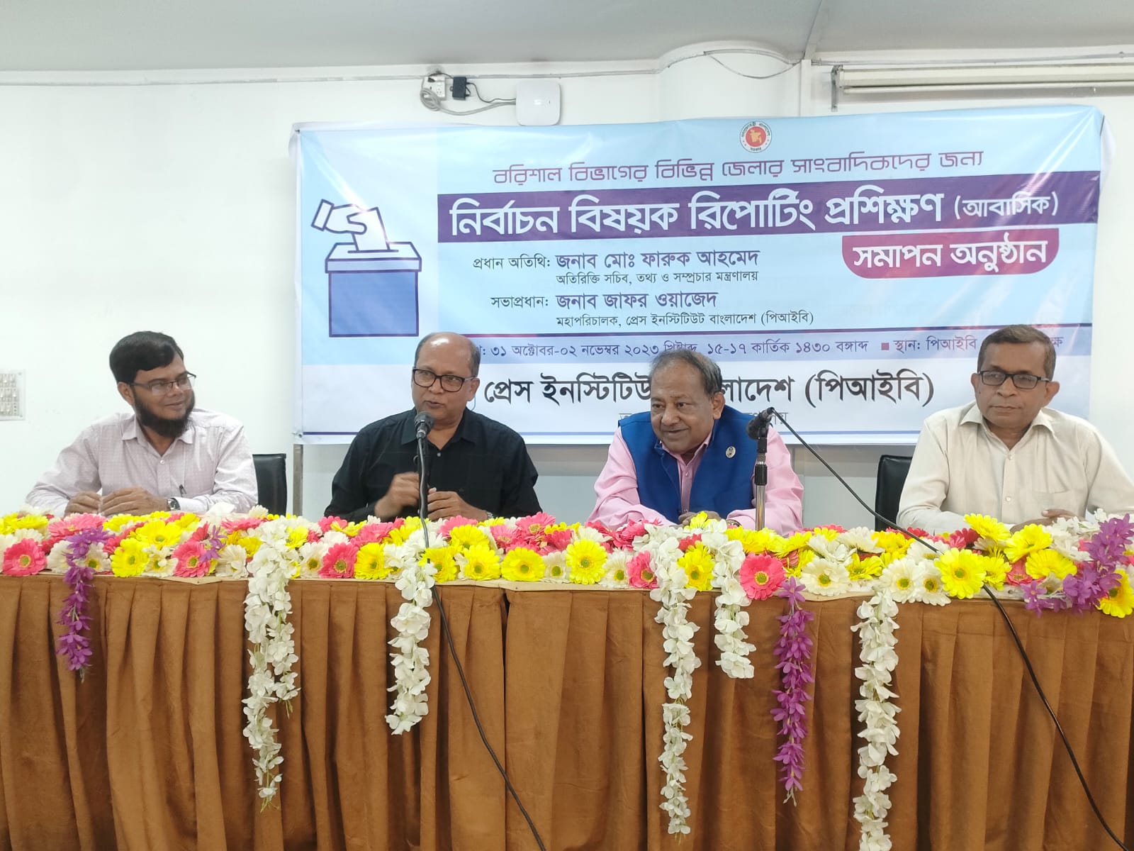 অনুষ্ঠানের সভাপ্রধান প্রেস ইনস্টিটিউট বাংলাদেশ (পিআইবি) এর মহাপরিচালক জাফর ওয়াজেদ নির্বাচনকালীন রিপোর্টিংয়ের জন্য সংবিধান ও নির্বাচনী আচরণবিধি সম্বন্ধে সম্যক ধারণা রাখার কথা বলেন। এছাড়া নির্বাচনী প্রতিবেদন ও অন্যান্য বিষয় নিয়ে পূর্বেই মাঠ পর্যায়ে কাজ করার কথাও উল্লেখ করেন।